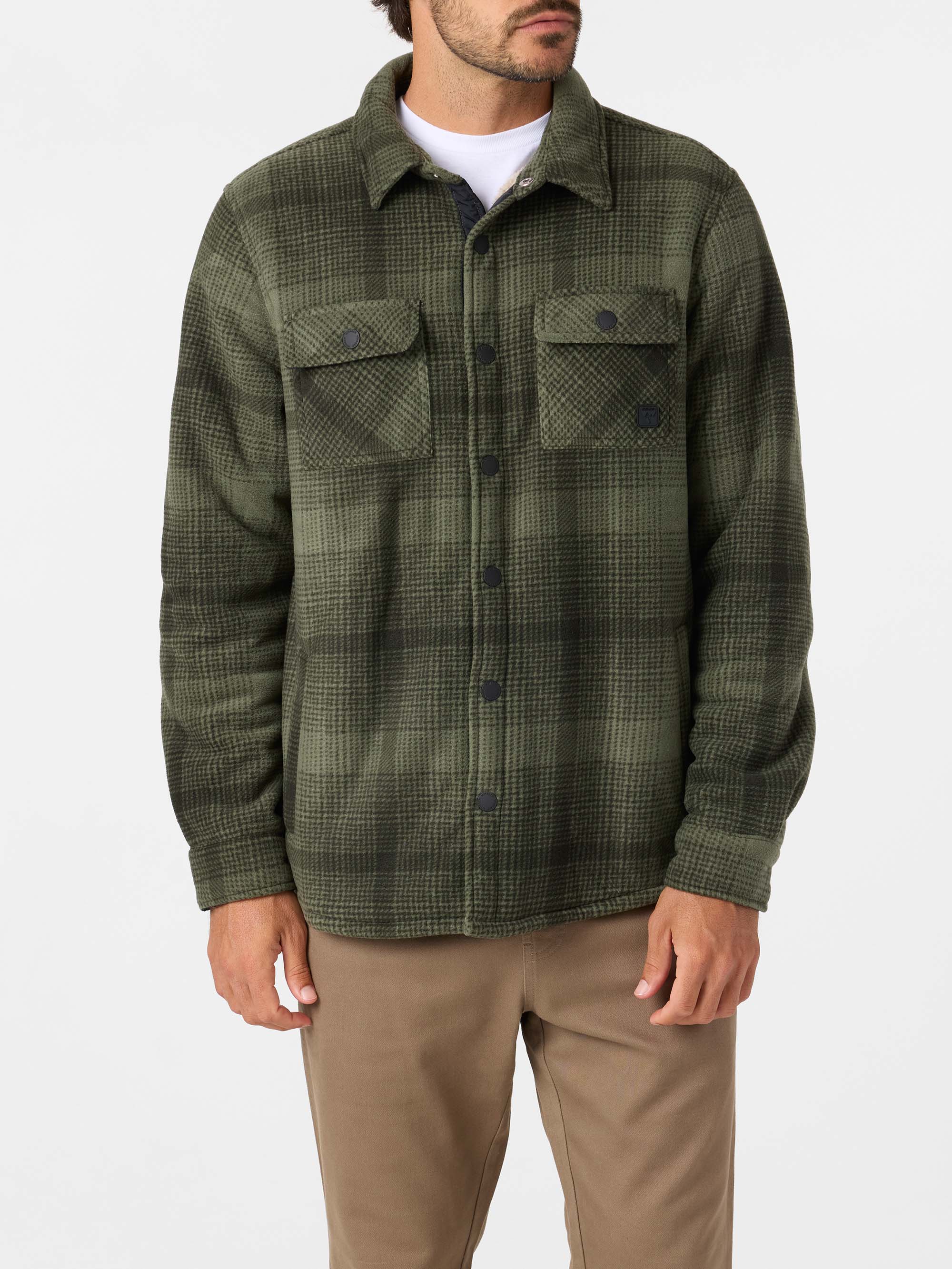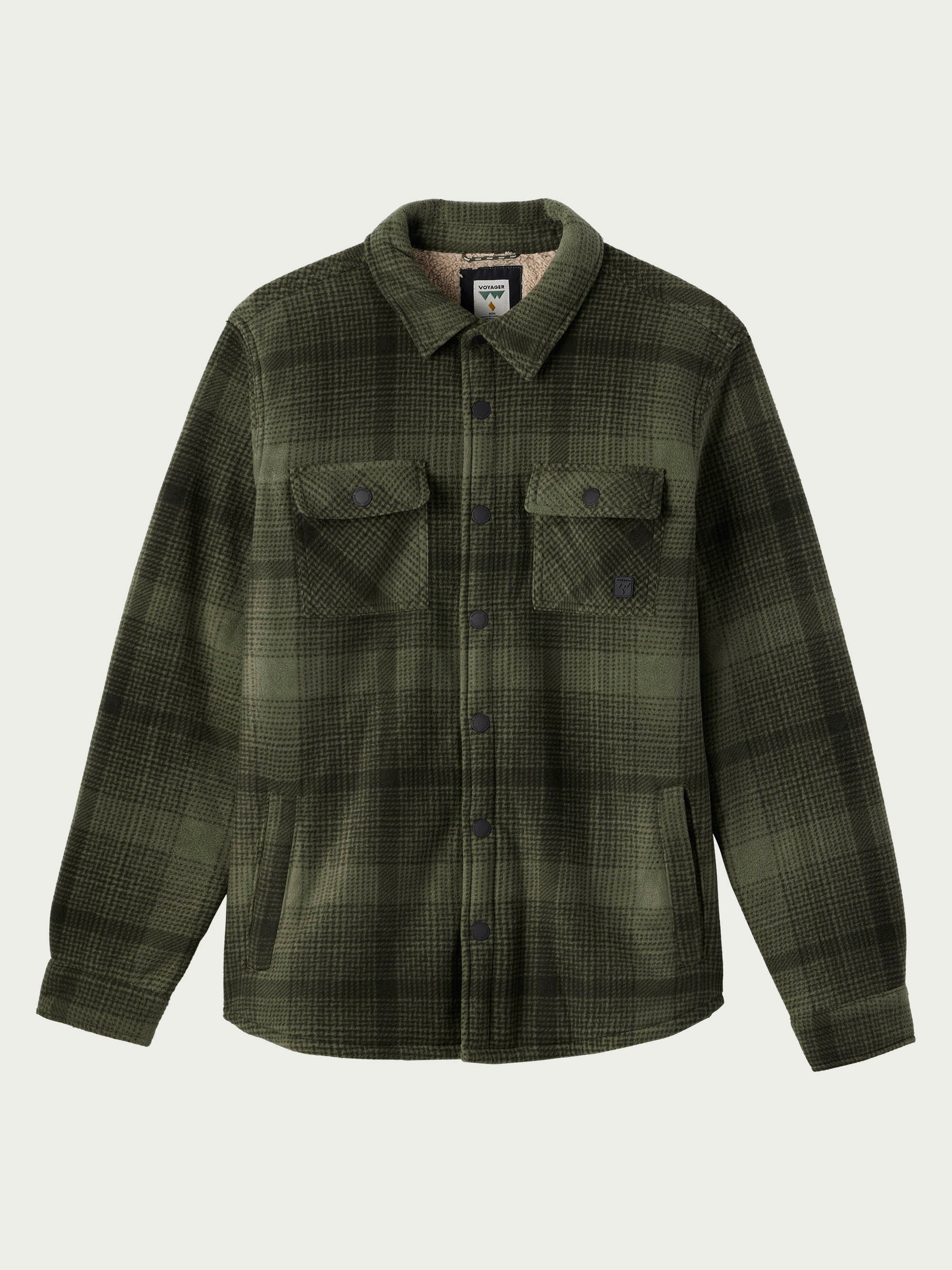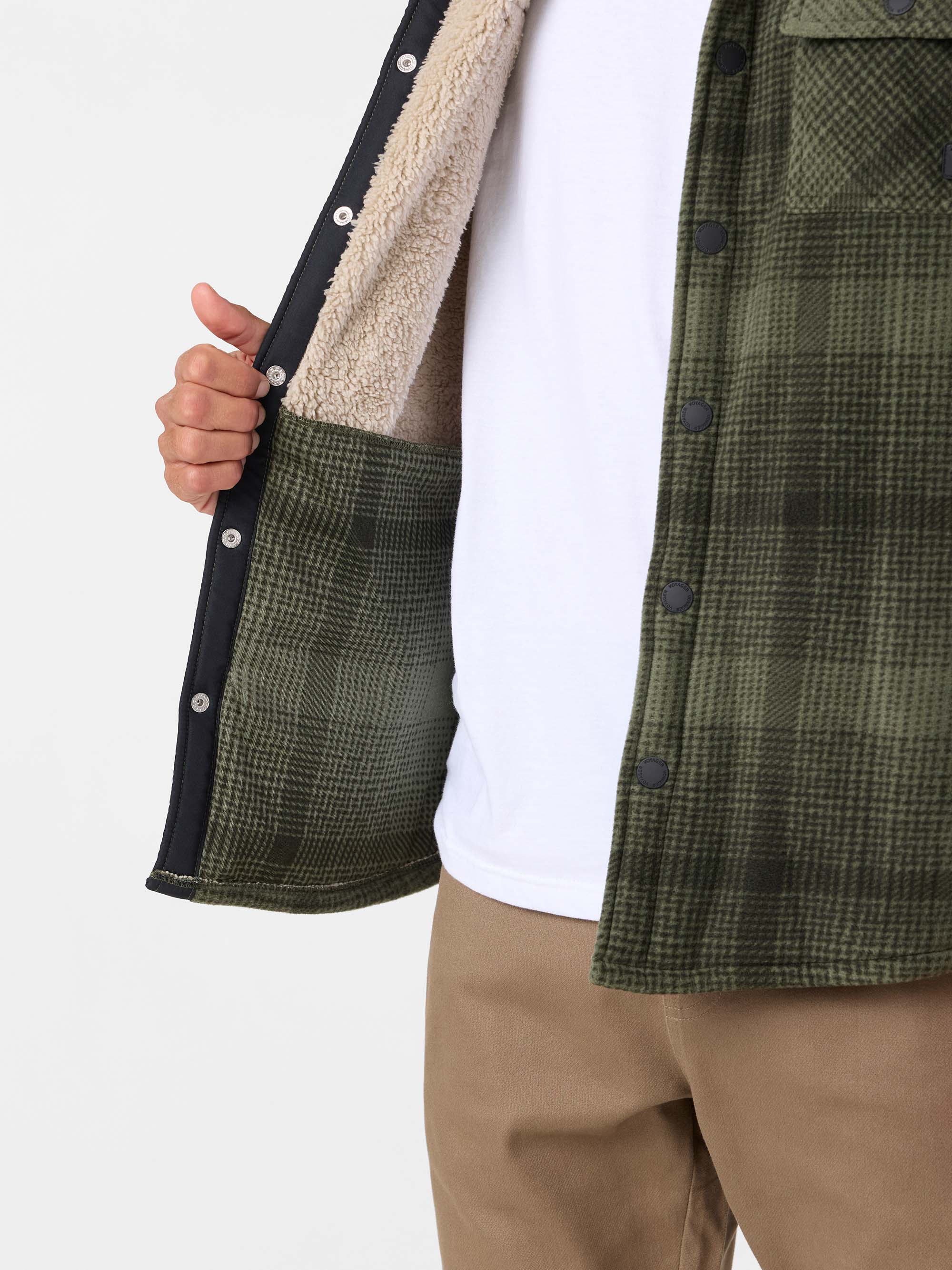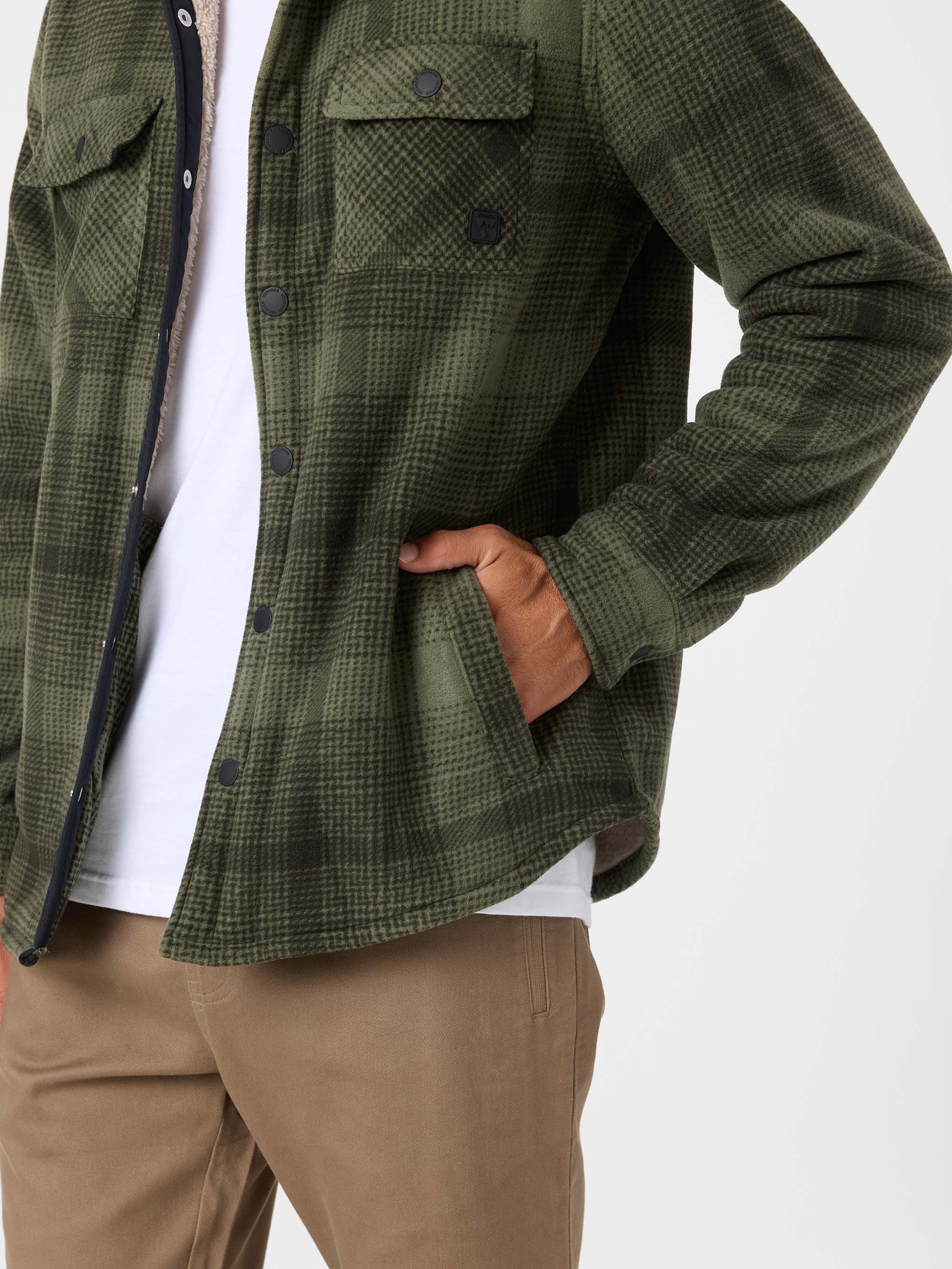 Keep the heat in and the cold out. This fleece button-up is high pile lined, has a front snap closure and relaxed fit.