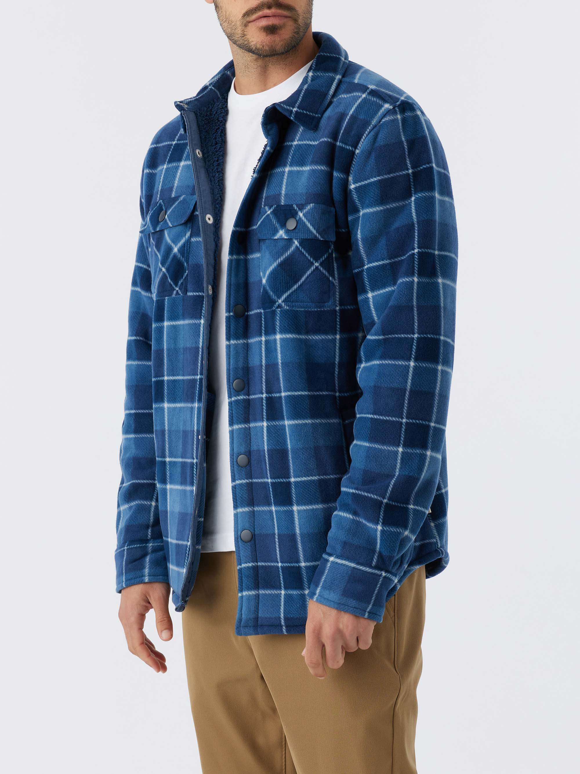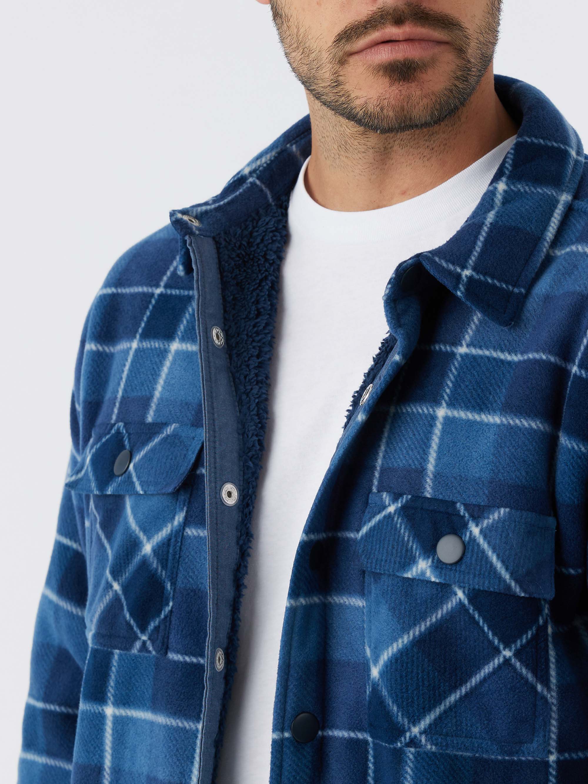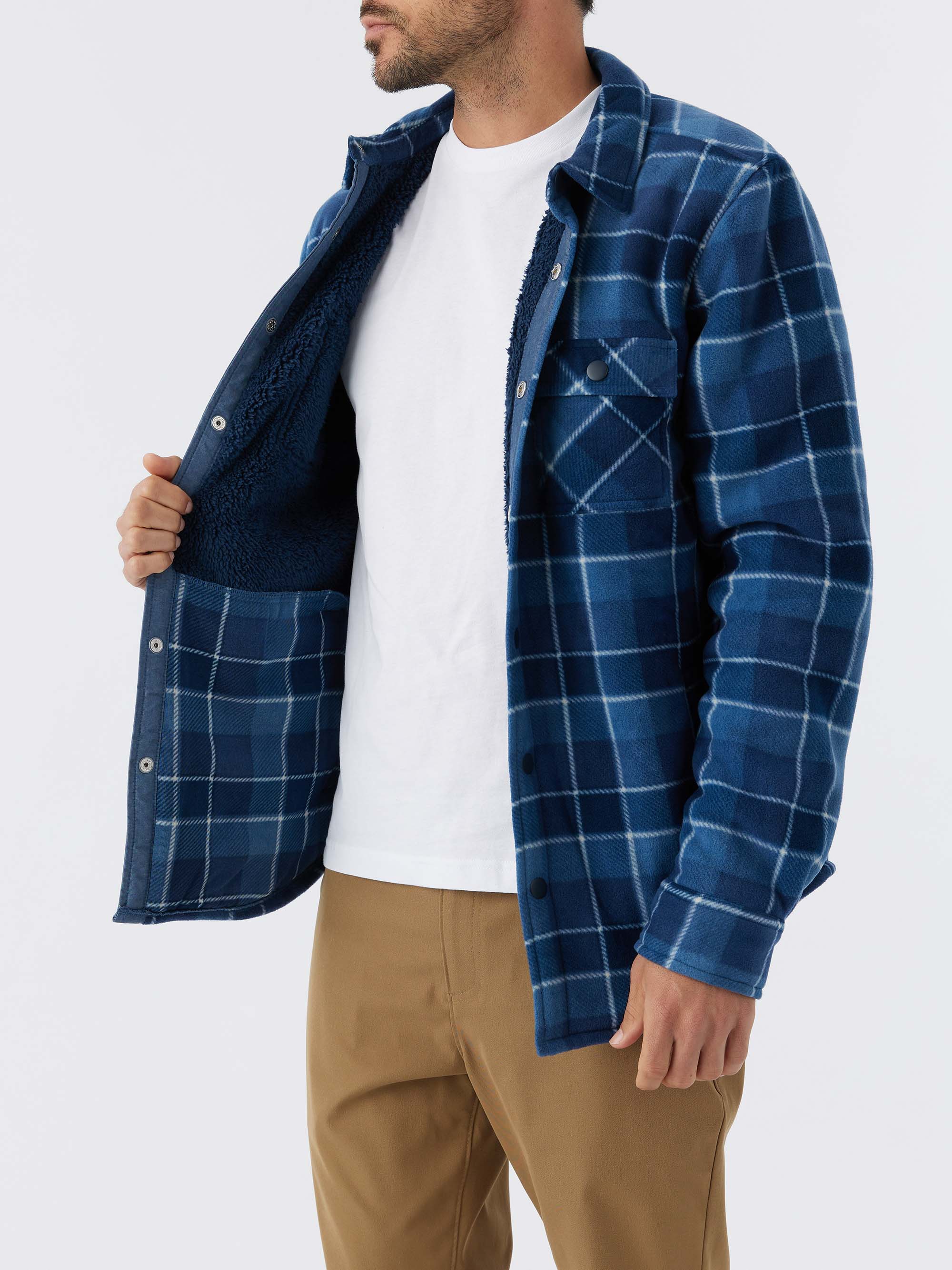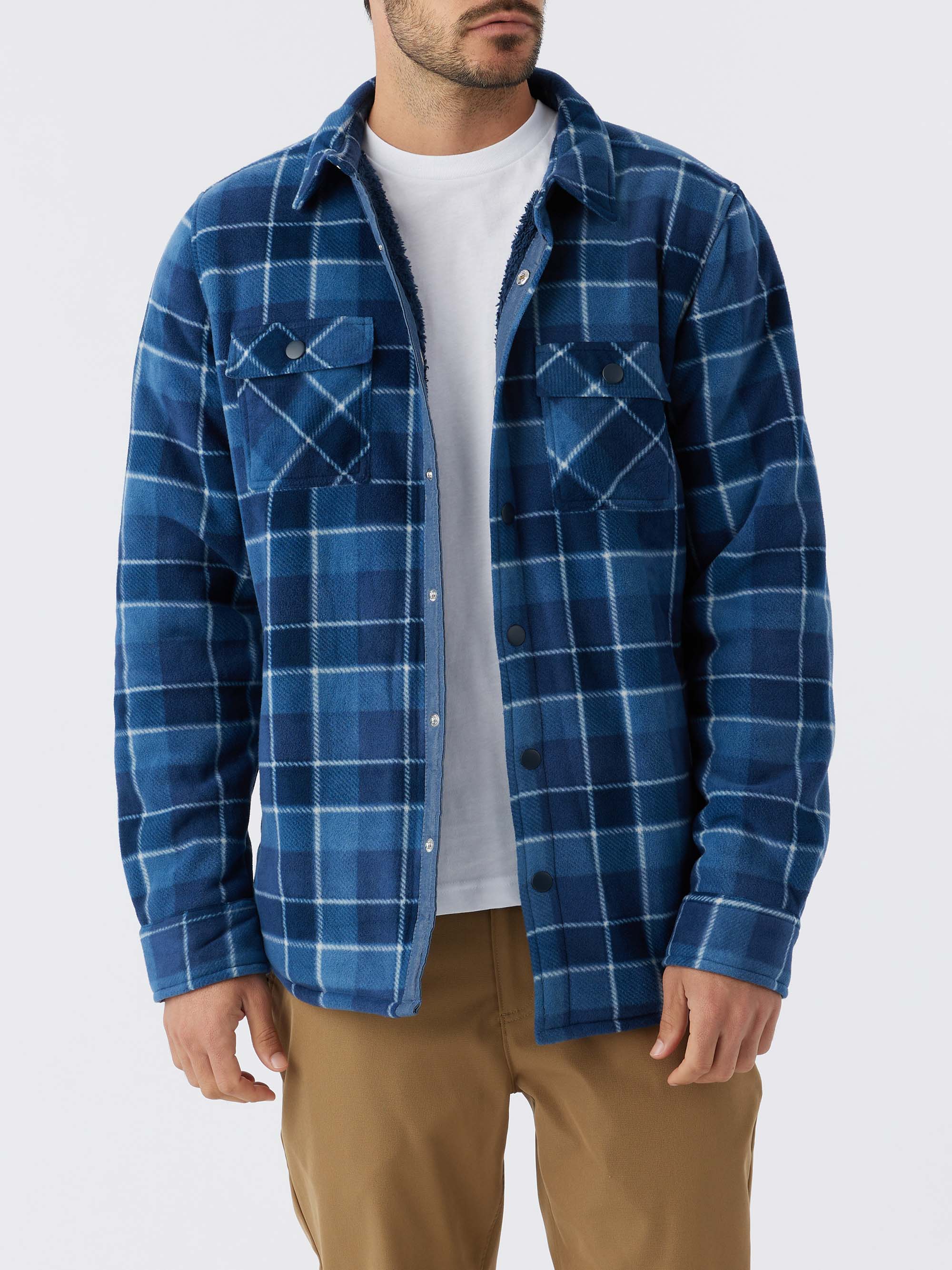 Keep the heat in and the cold out. This is a heavier fleece shirt jacket that is sherpa lined, has a front snap closure and relaxed fit.