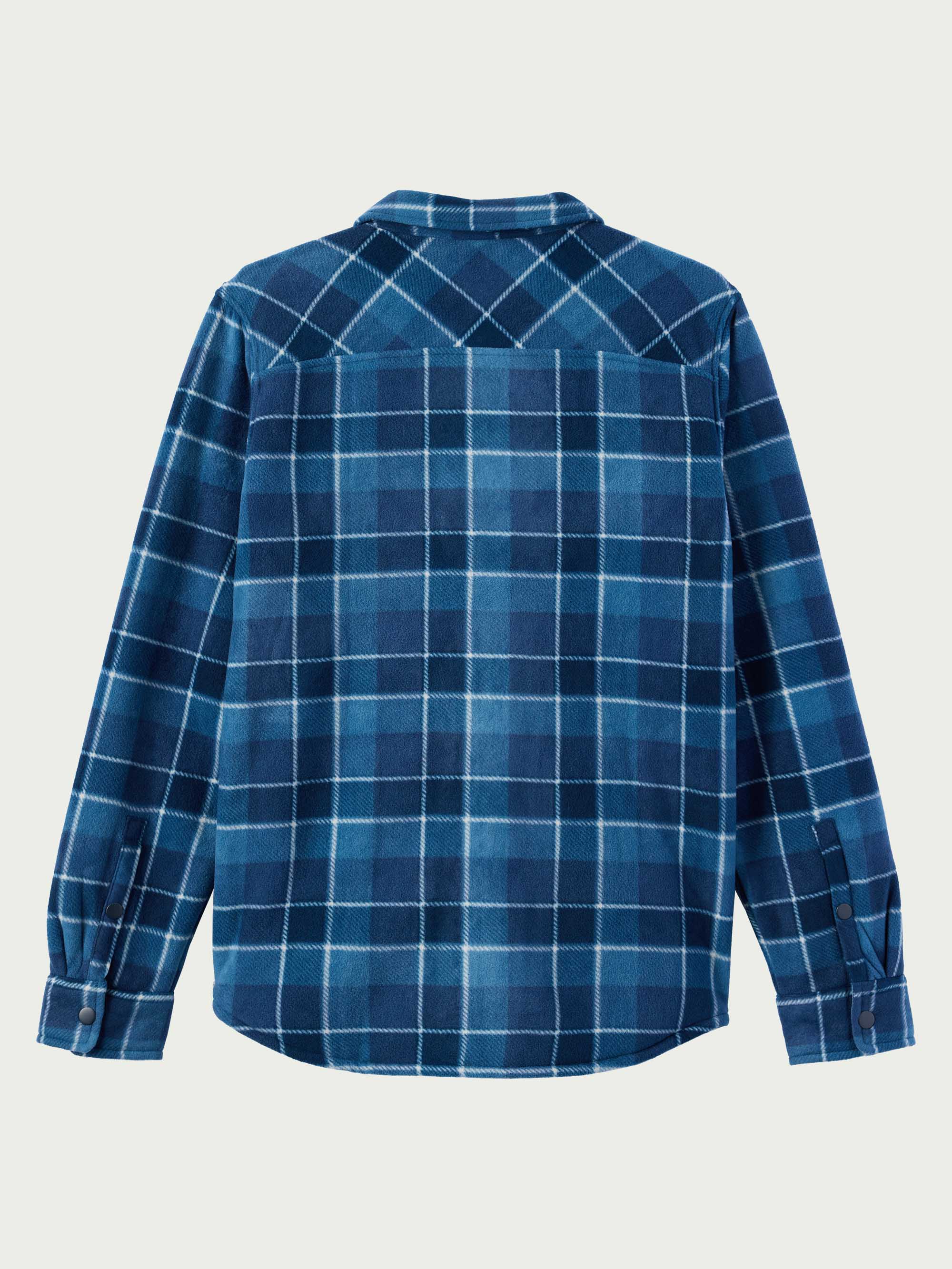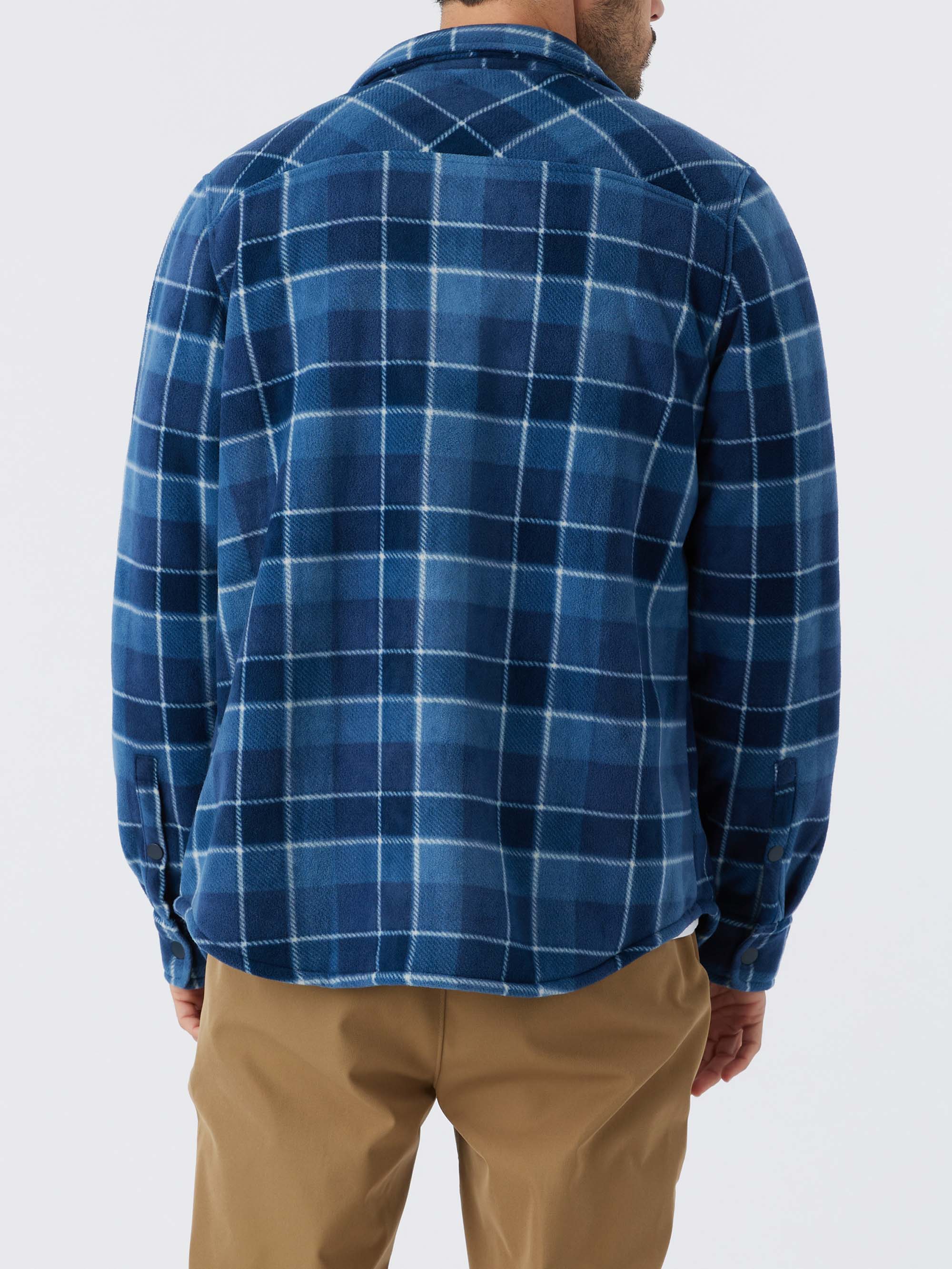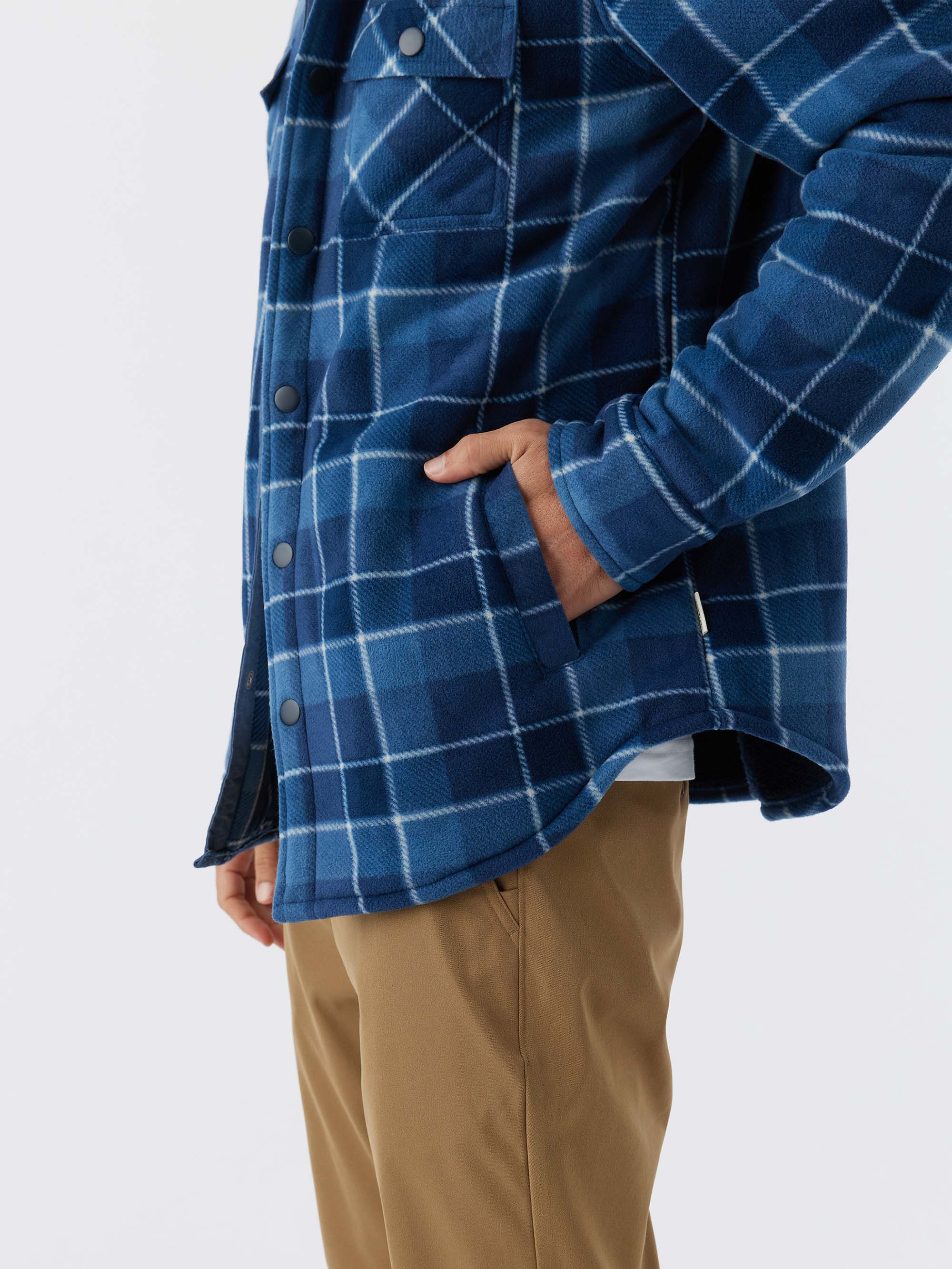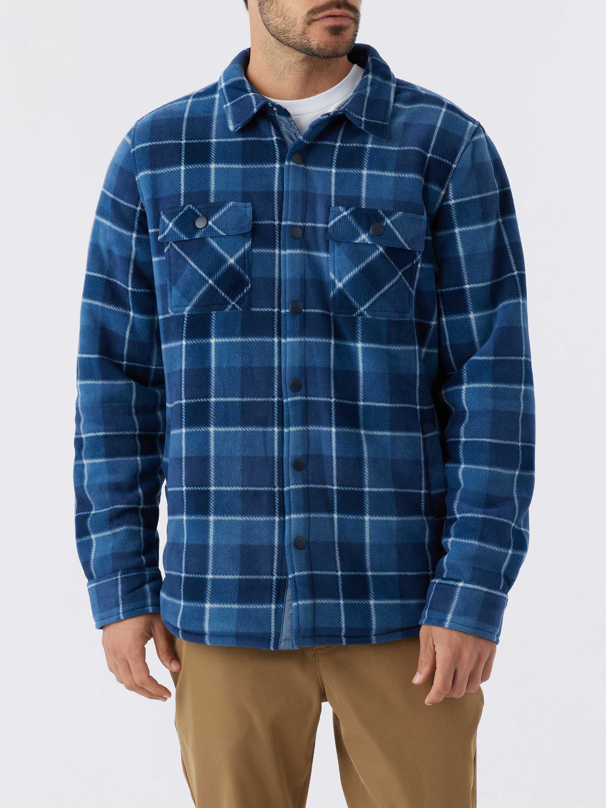 Keep the heat in and the cold out. This is a heavier fleece shirt jacket that is sherpa lined, has a front snap closure and relaxed fit.